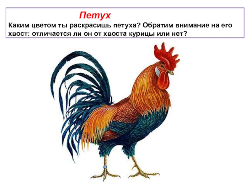 Каким цветом ты раскрасишь петуха? Обратим внимание на его