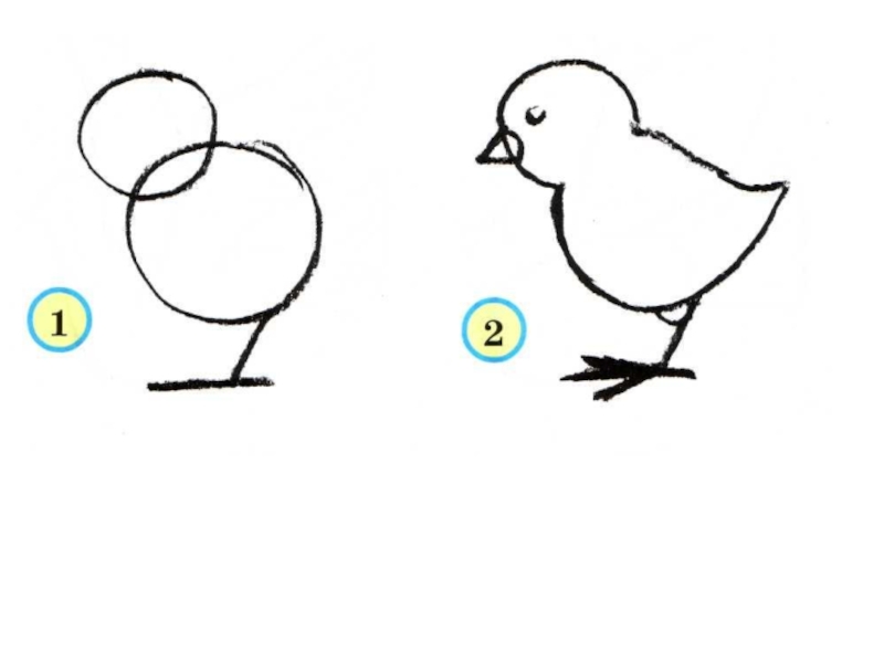 Начиная рисовать цыплёнка, нарисуем два кружочка, заходящих