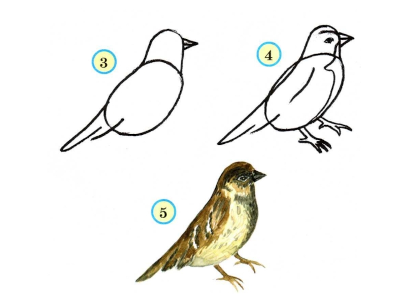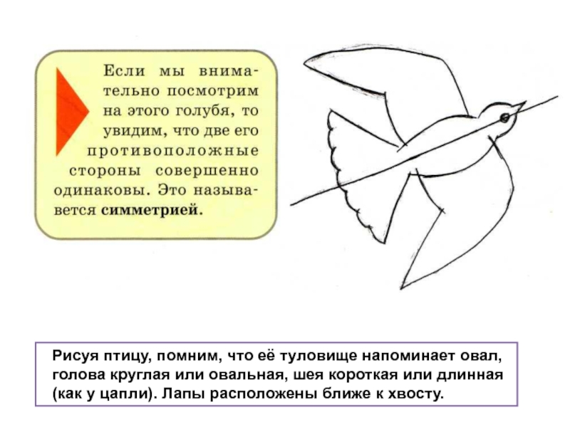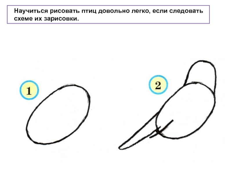 Слайд 4Рисуя птицу, помним, что её туловище напоминает овал,