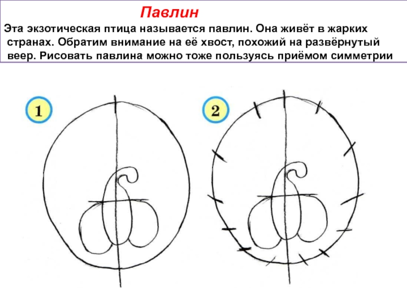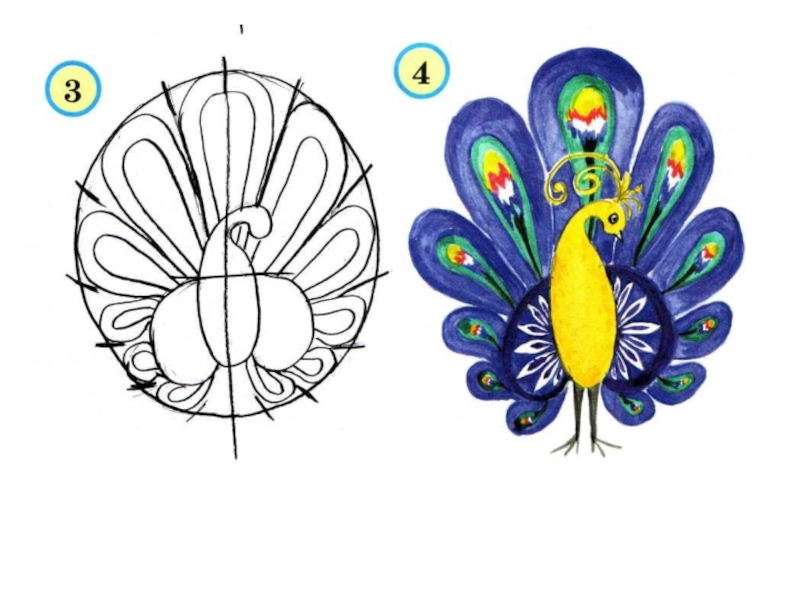 веер. Рисовать павлина можно тоже пользуясь приёмом симметрии