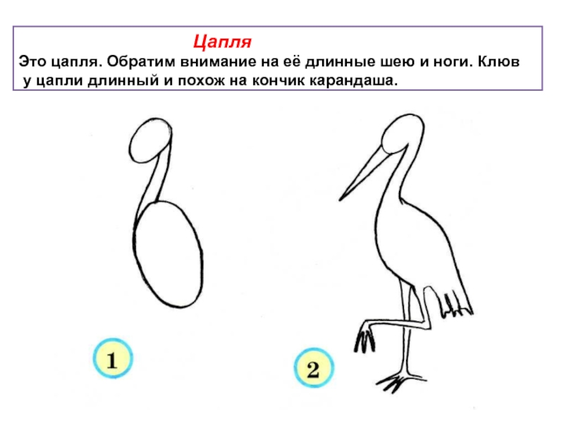 Рисуя птицу, помним, что её туловище напоминает овал, голова круглая или овальная, шея короткая или длинная(как у