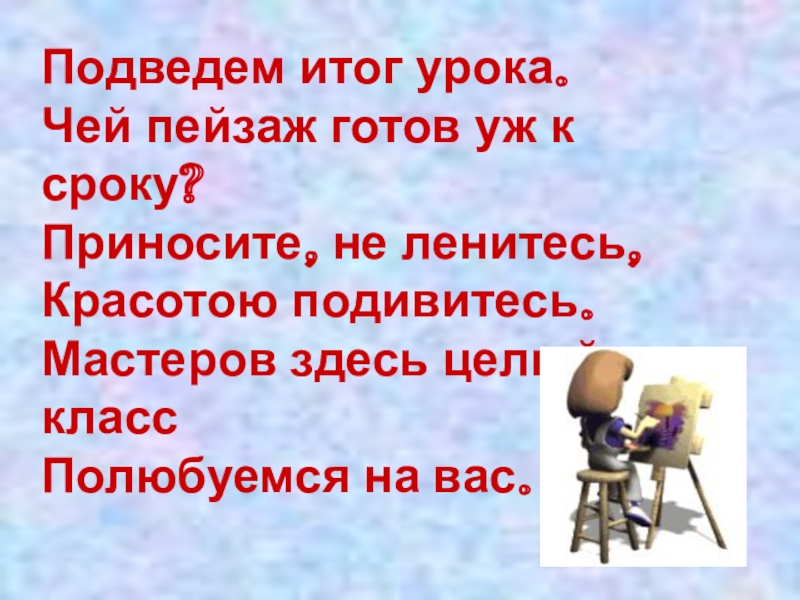 Слайд 10Подведем итог урока. Чей пейзаж готов уж к сроку? Приносите, не ленитесь, Красотою подивитесь. Мастеров