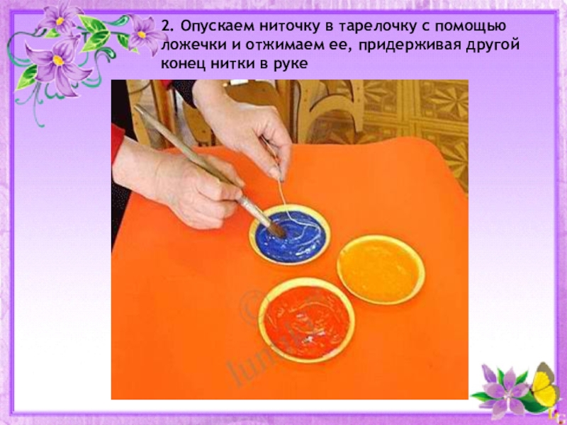 Слайд 222. Опускаем ниточку в краску, с помощью кисточки и отжимаем ее,