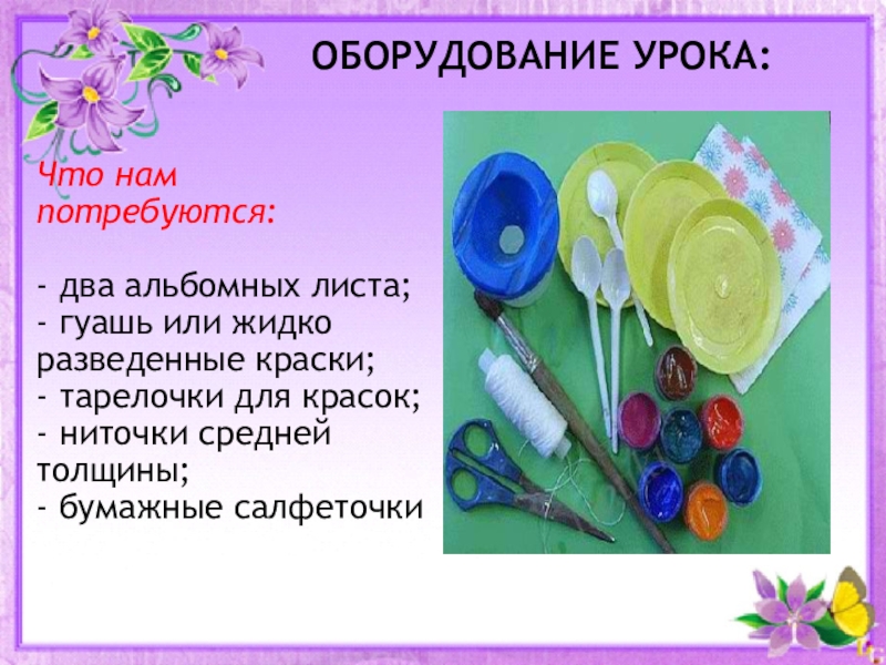 ОБОРУДОВАНИЕ УРОКА:Что нам потребуются:  - два альбомных листа; - гуашь или жидко разведенные краски; - тарелочки