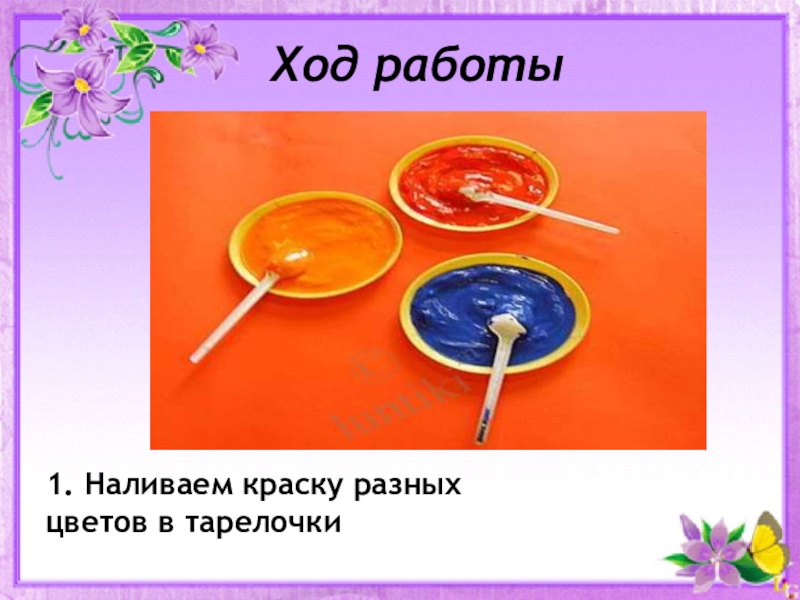 Ход работы 1. Наливаем краску разных цветов в тарелочки