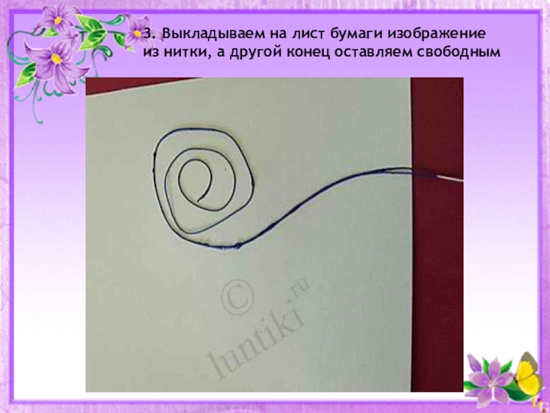 Слайд 433. Выкладываем на лист бумаги изображение из нитки, а другой конец