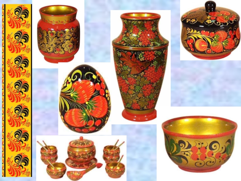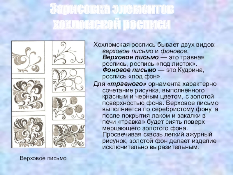 Слайд 11Хохломская роспись бывает двух видов: верховое письмо и фоновое. Верховое письмо