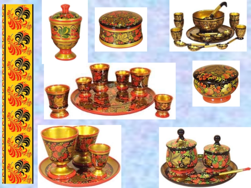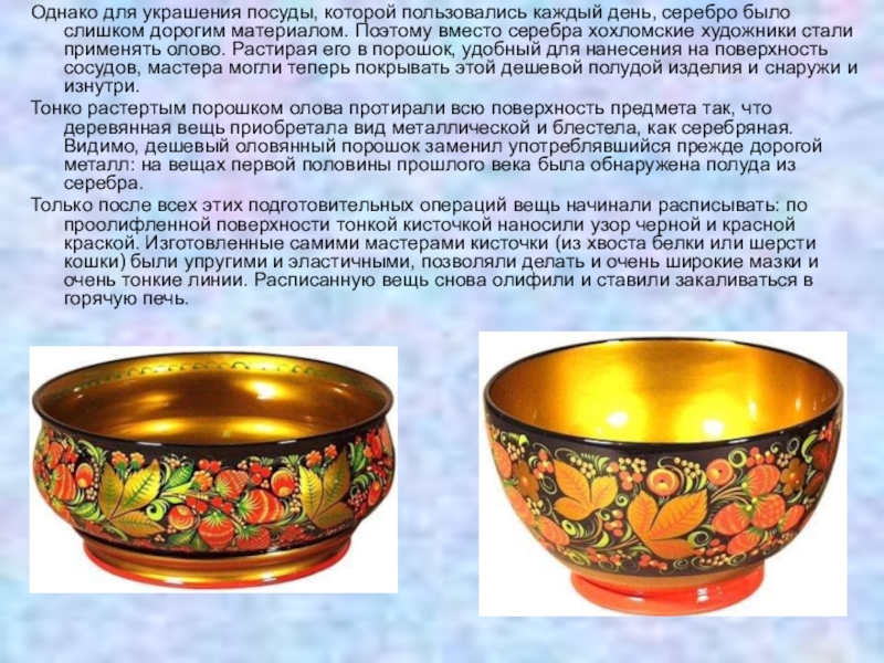 дорогим материалом. Поэтому вместо серебра хохломские художники стали применять олово. Растирая его в порошок, удобный для нанесения на поверхность сосудов, мастера могли теперь покрывать этой дешевой полудой изделия и снаружи и изнутри.