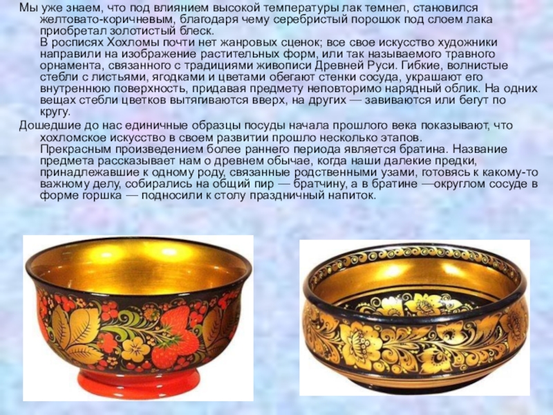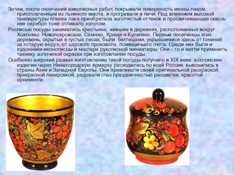лак был так хорош, что выдерживал высокую температуру. От горячей пищи посуда не меняла цвета, не теряла своей красивой росписи.