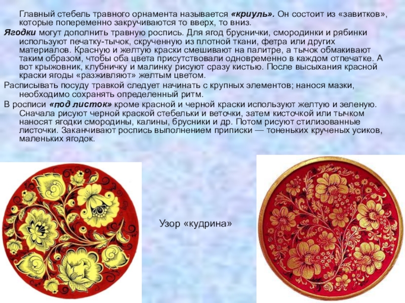 — это травная роспись, роспись «под листок». Фоновое письмо — это Кудрина, роспись «под фон».