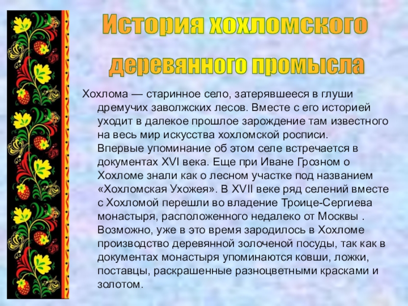 с его историей уходит в далекое прошлое зарождение там известного на весь мир искусства хохломской росписи.