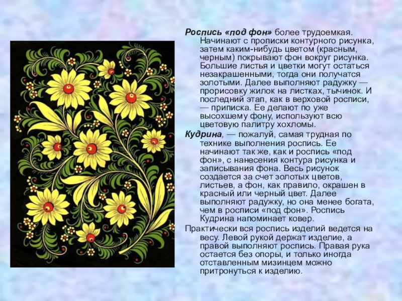Слайд 14Роспись «под фон» более трудоемкая. Начинают с прописки контурного рисунка, затем