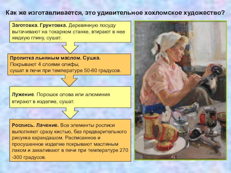 Но пользоваться неокрашенной деревянной посудой неудобно: древесина впитывает в себя жидкость, быстро загрязняется. Заметили, что промаслившиеся стенки сосудов легче моются, посуда дольше сохраняется. Тогда-то, вероятно, и « возникла мысль покрывать посуду олифой — варёным льняным маслом. Олифа покрывала поверхность предмета непроницаемой пленкой. Этот состав, применявшийся иконописцами для предохранения живописи от влаги, был известен русским мастерам с давних пор.