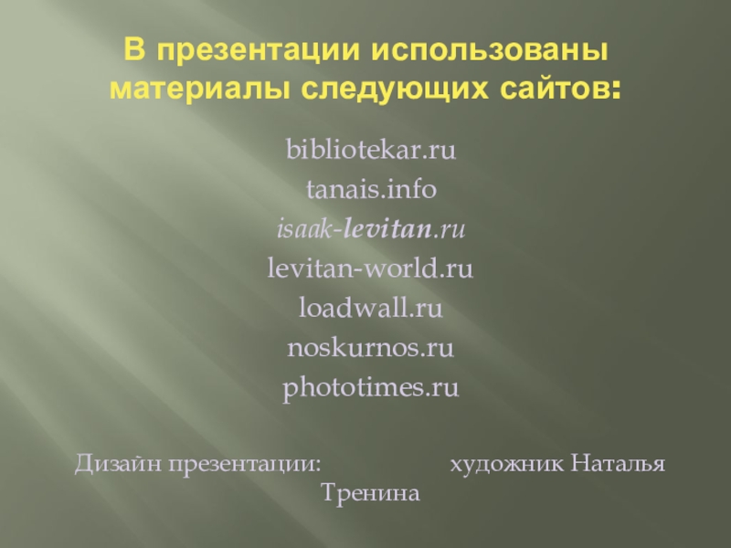 В презентации использованы материалы следующих сайтов:bibliotekar.rutanais.infoisaak-levitan.rulevitan-world.ruloadwall.runoskurnos.ruphototimes.ruДизайн презентации: