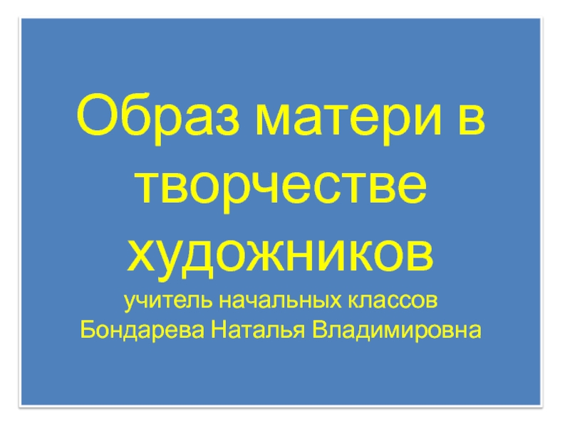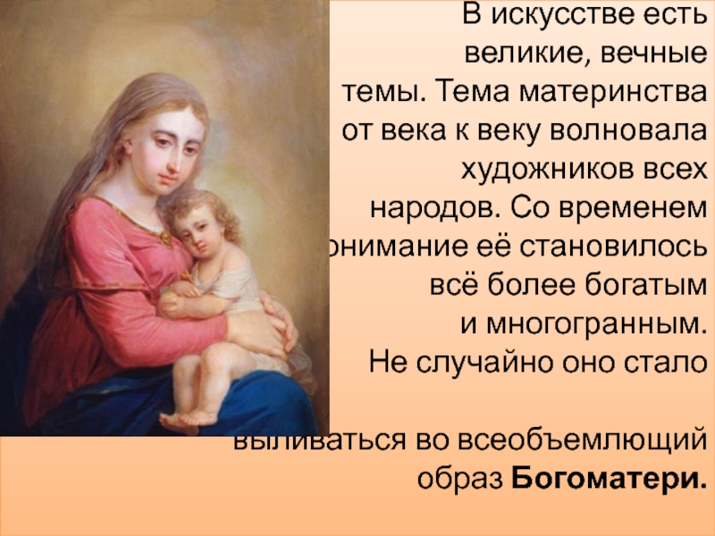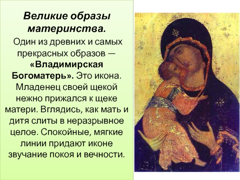 Богоматерь». Это икона. Младенец своей щекой нежно прижался к щеке матери. Вглядись, как мать и дитя слиты в неразрывное целое. Спокойные, мягкие линии придают иконе звучание покоя и вечности.