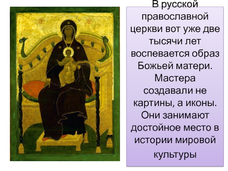 Божьей матери. Мастера создавали не картины, а иконы. Они занимают достойное место в истории мировой культуры