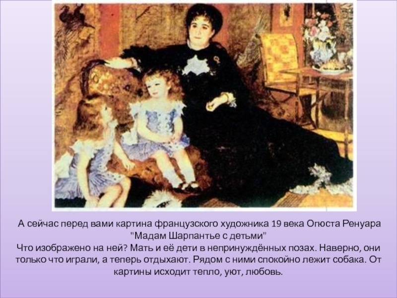 Что изображено на ней? Мать и её дети в непринуждённых позах. Наверно, они только что играли, а теперь отдыхают. Рядом с ними спокойно лежит собака. От картины исходит тепло, уют, любовь.