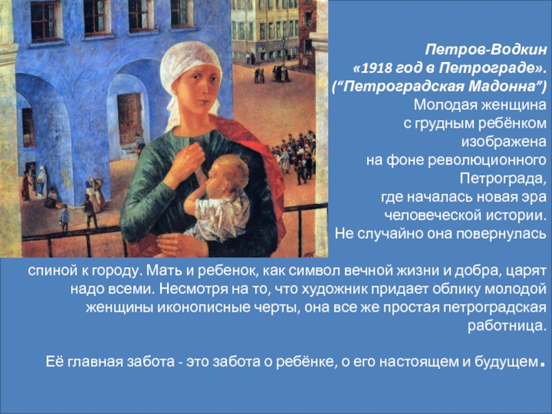 спиной к городу. Мать и ребенок, как символ вечной жизни и добра, царят надо всеми. Несмотря на то, что художник придает облику молодой женщины иконописные черты, она все же простая петроградская работница.