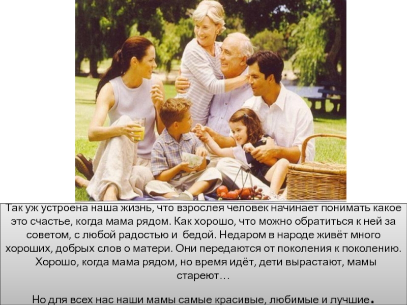 это счастье, когда мама рядом. Как хорошо, что можно обратиться к ней за советом, с любой радостью и бедой. Недаром в народе живёт много хороших, добрых слов о матери. Они передаются от поколения к поколению.
