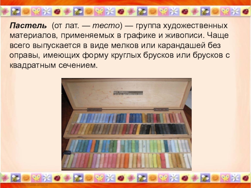 *Пастель (от лат. — тесто) — группа художественных материалов, применяемых в графике и живописи. Чаще всего выпускается в виде
