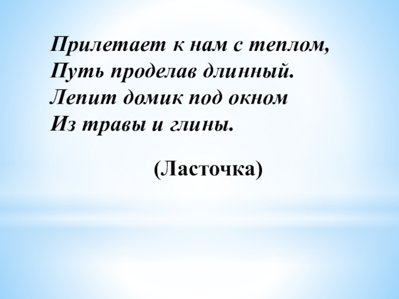 Прилетает к нам с теплом,Путь проделав длинный.Лепит домик под окномИз травы и глины.(Ласточка)