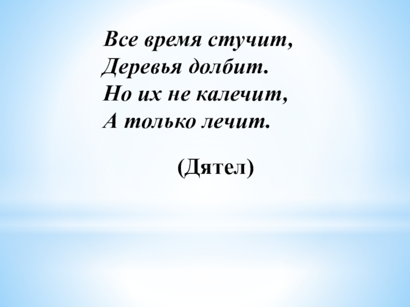Все время стучит,Деревья долбит.Но их не калечит,А только лечит.(Дятел)