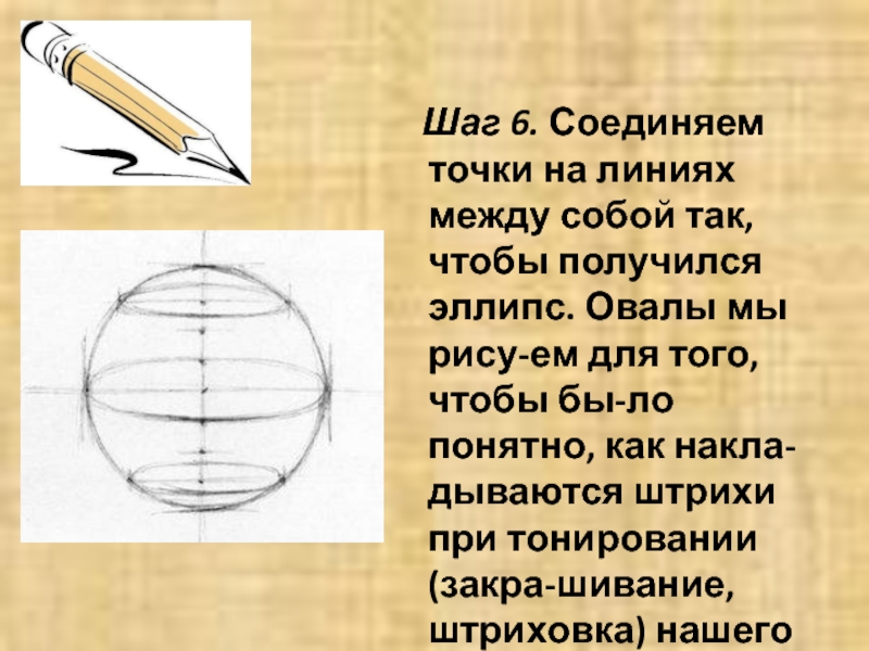 чтобы получился эллипс. Овалы мы рису-ем для того, чтобы бы-ло понятно, как накла-дываются штрихи при тонировании (закра-шивание, штриховка) нашего шара.