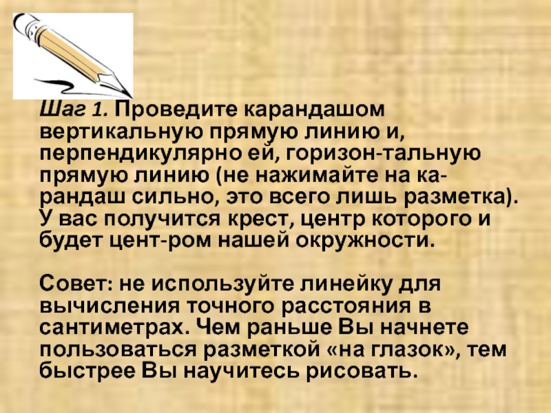 ей, горизон-тальную прямую линию (не нажимайте на ка-рандаш сильно, это всего лишь разметка). У вас получится крест, центр которого и будет цент-ром нашей окружности. Совет: не используйте линейку для вычисления точного расстояния в сантиметрах. Чем раньше Вы начнете пользоваться разметкой «на глазок», тем быстрее Вы научитесь рисовать.