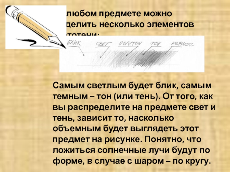 На любом предмете можно выделить несколько элементов светотени:Самым светлым будет блик, самым темным – тон