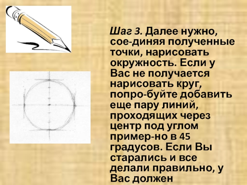 окружность. Если у Вас не получается нарисовать круг, попро-буйте добавить еще пару линий, проходящих через центр под углом пример-но в 45 градусов. Если Вы старались и все делали правильно, у Вас должен получиться круг.