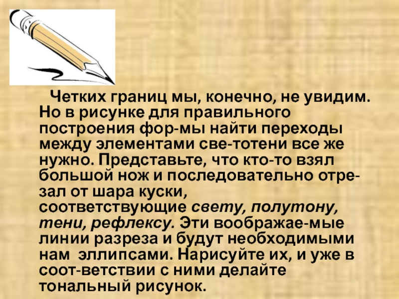 в рисунке для правильного построения фор-мы найти переходы между элементами све-тотени все же нужно. Представьте, что кто-то взял большой нож и последовательно отре-зал от шара куски, соответствующие свету, полутону, тени, рефлексу. Эти воображае-мые линии разреза и будут необходимыми нам  эллипсами. Нарисуйте их, и уже в соот-ветствии с ними делайте тональный рисунок.