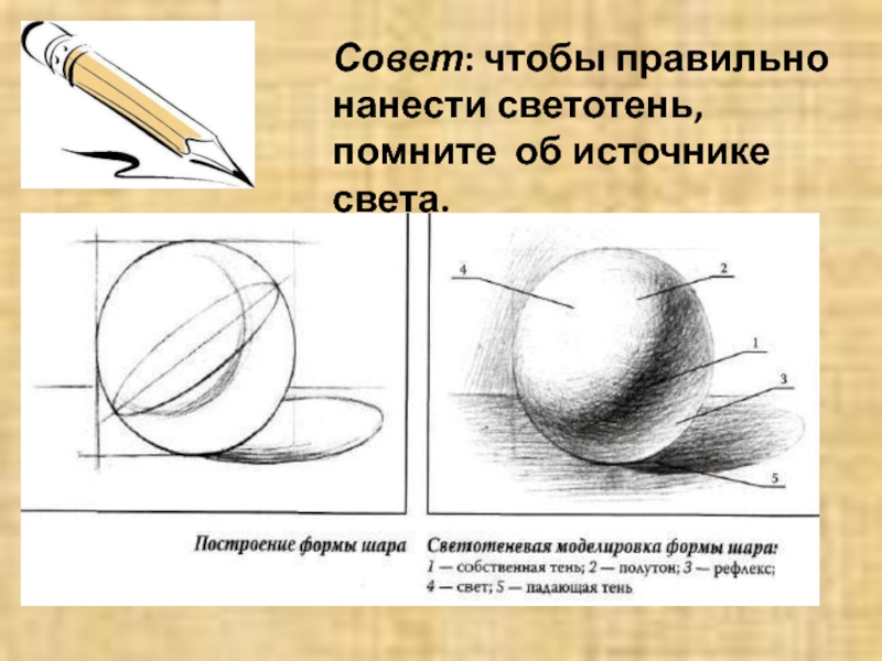 Слайд 11Совет: чтобы правильно нанести светотень, помните об источнике света.