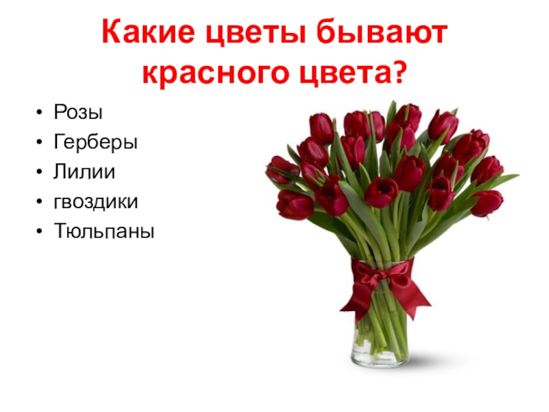 Какие цветы бывают красного цвета?РозыГерберыЛилиигвоздикиТюльпаны