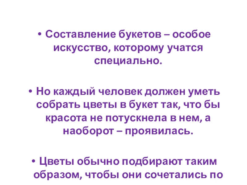 должен уметь собрать цветы в букет так, что бы красота не потускнела в нем, а наоборот – проявилась.