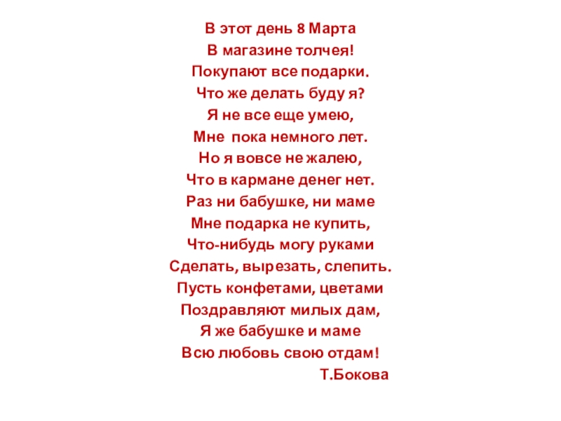 В этот день 8 МартаВ магазине толчея!Покупают все подарки.Что же делать буду я?Я не все еще умею,Мне пока немного лет.Но я вовсе не жалею,Что в кармане денег нет.Раз ни бабушке, ни мамеМне подарка не купить,Что-нибудь могу