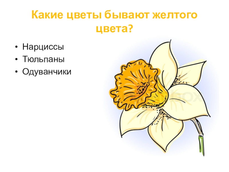 Какие цветы бывают желтого цвета?НарциссыТюльпаныОдуванчики