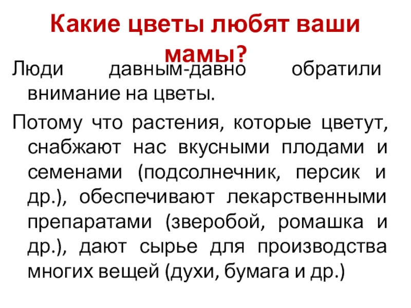 Какие цветы любят ваши мамы?Люди давным-давно обратили внимание на цветы. Потому что растения, которые цветут, снабжают нас