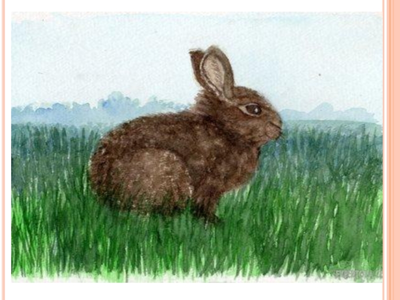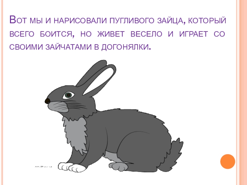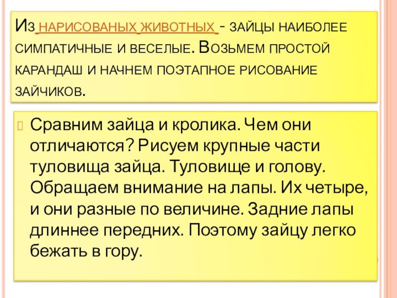 Сравним зайца и кролика. Чем они отличаются? Рисуем крупные части туловища зайца. Туловище и голову. Обращаем внимание на лапы. Их четыре, и они разные по величине. Задние лапы длиннее передних. Поэтому зайцу легко бежать в гору.