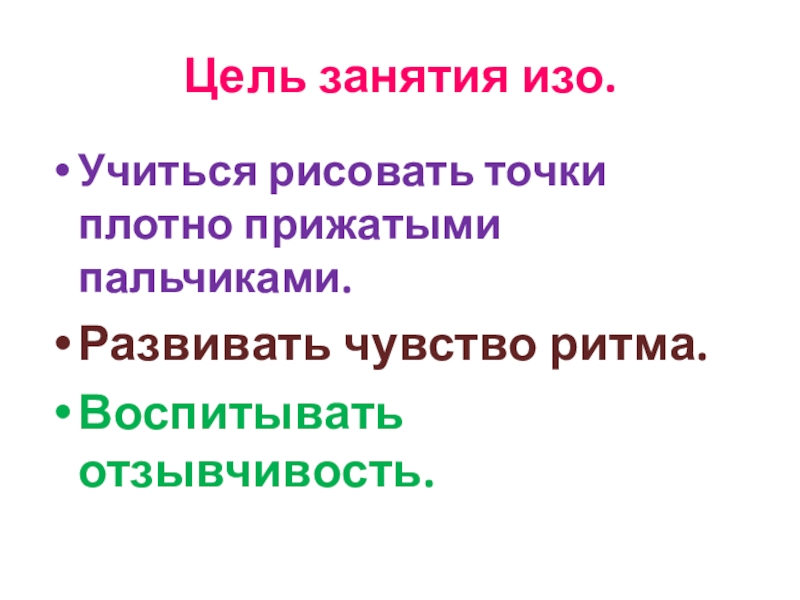 Цель занятия изо.Учиться рисовать точки плотно прижатыми пальчиками.Развивать чувство ритма.Воспитывать отзывчивость.