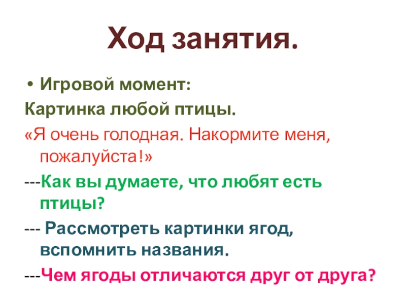 Ход занятия.Игровой момент: Картинка любой птицы.«Я очень голодная. Накормите меня, пожалуйста!»---Как вы думаете, что любят есть птицы?---