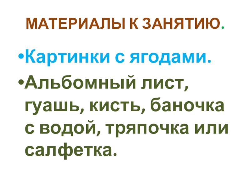 МАТЕРИАЛЫ К ЗАНЯТИЮ.Картинки с ягодами.Альбомный лист, гуашь, кисть, баночка с водой, тряпочка или салфетка.