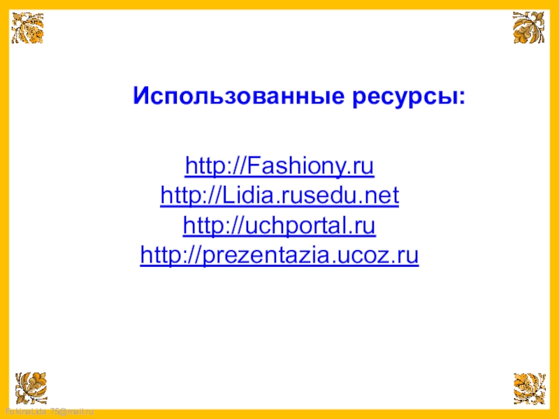 Использованные ресурсы:http://Fashiony.ruhttp://Lidia.rusedu.nethttp://uchportal.ruhttp://prezentazia.ucoz.ru