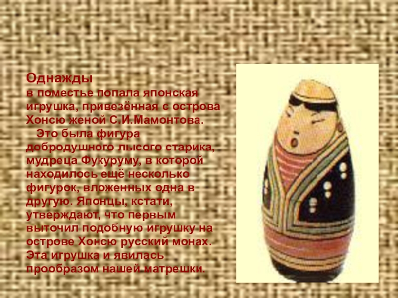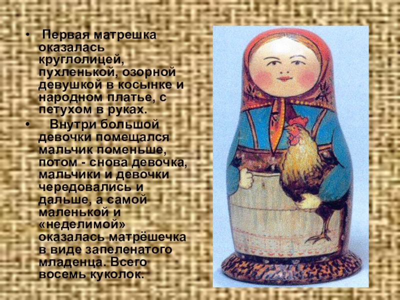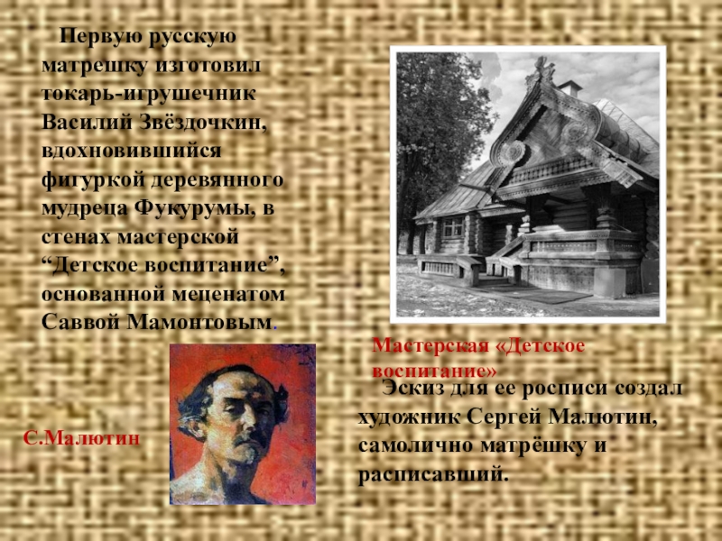 Эскиз для ее росписи создал художник Сергей Малютин, самолично матрёшку и расписавший.