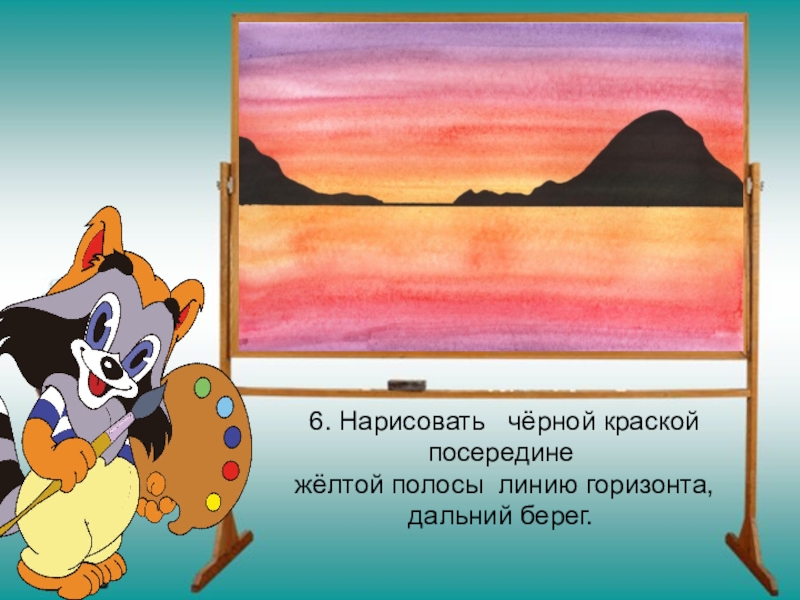 6. Нарисовать  чёрной краской посередине   жёлтой полосы линию горизонта, дальний берег.