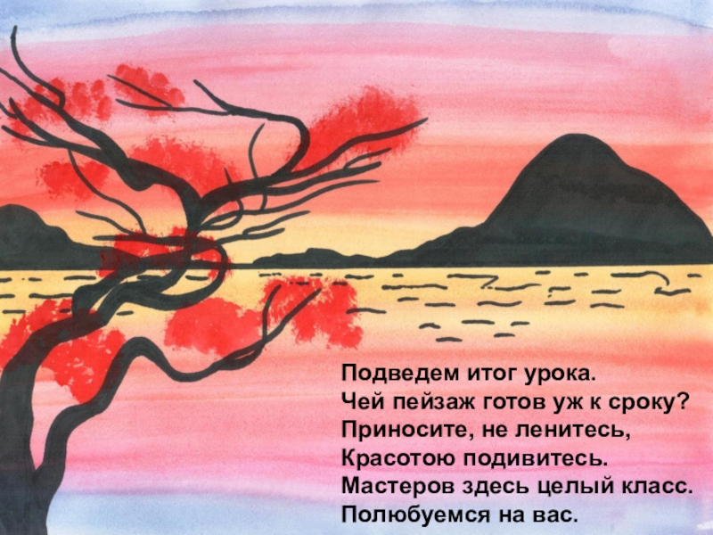 Подведем итог урока. Чей пейзаж готов уж к сроку? Приносите, не ленитесь, Красотою подивитесь. Мастеров здесь целый