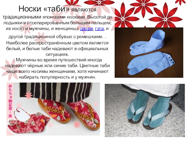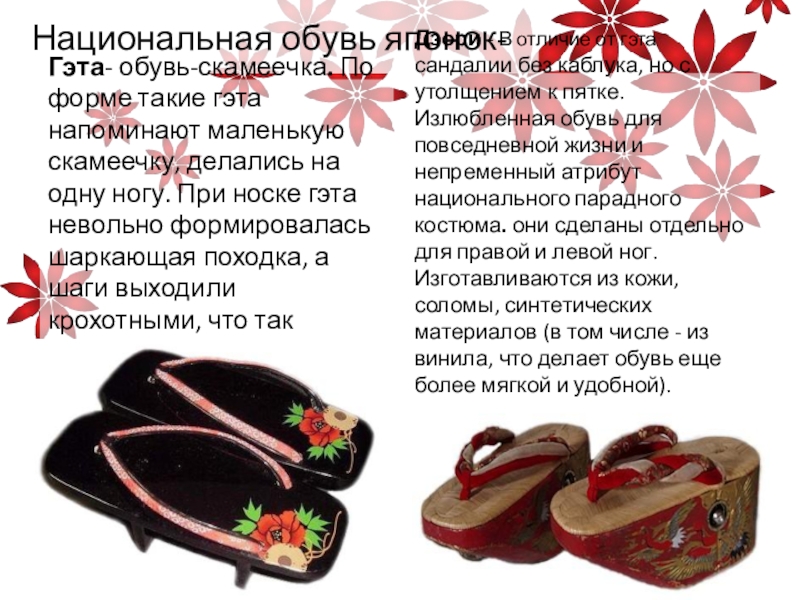 Дзори - В отличие от гэта сандалии без каблука, но с утолщением к пятке. Излюбленная обувь для повседневной жизни и непременный атрибут национального парадного костюма. они сделаны отдельно для правой и левой ног. Изготавливаются из кожи, соломы, синтетических материалов (в том числе - из винила, что делает обувь еще более мягкой и удобной).