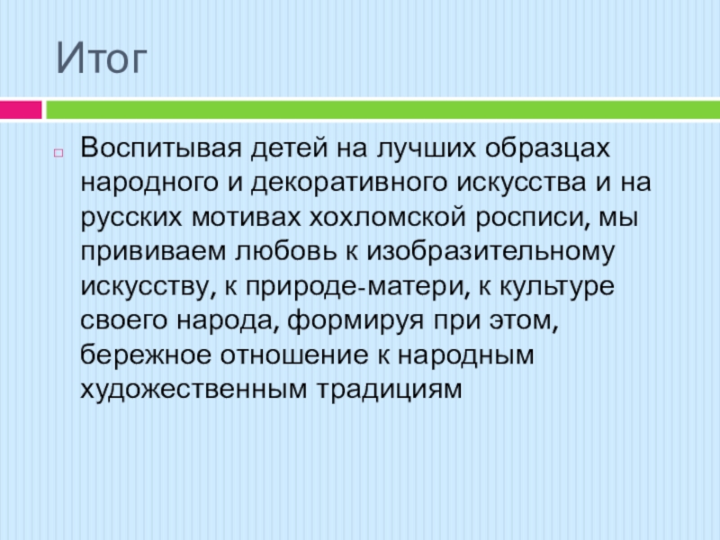 русских мотивах хохломской росписи, мы прививаем любовь к изобразительному искусству, к природе-матери, к культуре своего народа, формируя при этом, бережное отношение к народным художественным традициям