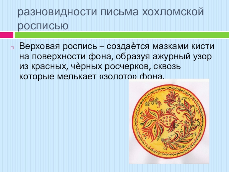 Верховая роспись – создаѐтся мазками кисти на поверхности