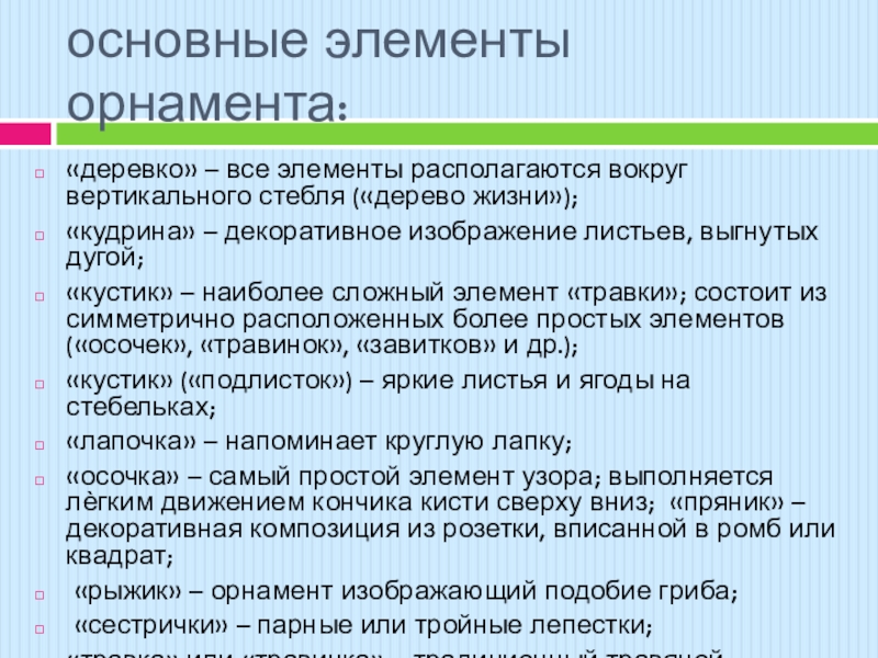 «осочка» – самый простой элемент узора; выполняется лѐгким движением кончика кисти сверху вниз; «пряник» – декоративная композиция из розетки, вписанной в ромб или квадрат;