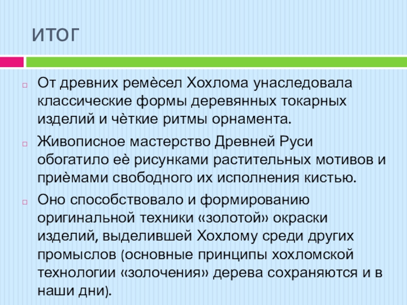 Оно способствовало и формированию оригинальной техники «золотой» окраски изделий, выделившей Хохлому среди других промыслов (основные принципы хохломской технологии «золочения» дерева сохраняются и в наши дни).